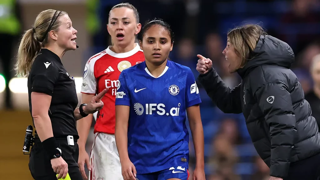 The flashpoint came near the end when McCabe was involved in an incident with Alyssa Thompson. Bompastor argued that VAR should have intervened and that Arsenal should have been reduced to 10 players. Instead, no red card followed, and Chelsea’s coach reacted angrily enough to be cautioned before receiving a second booking moments later.